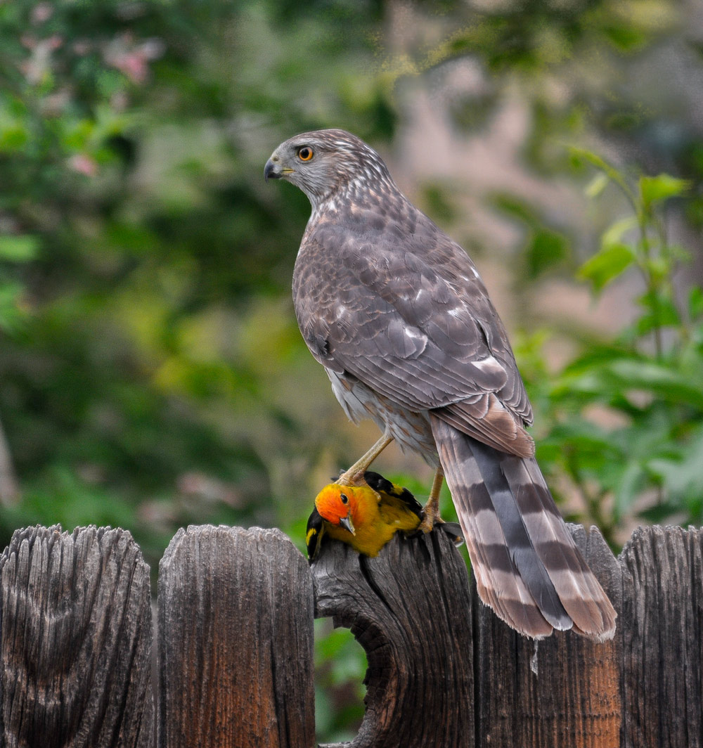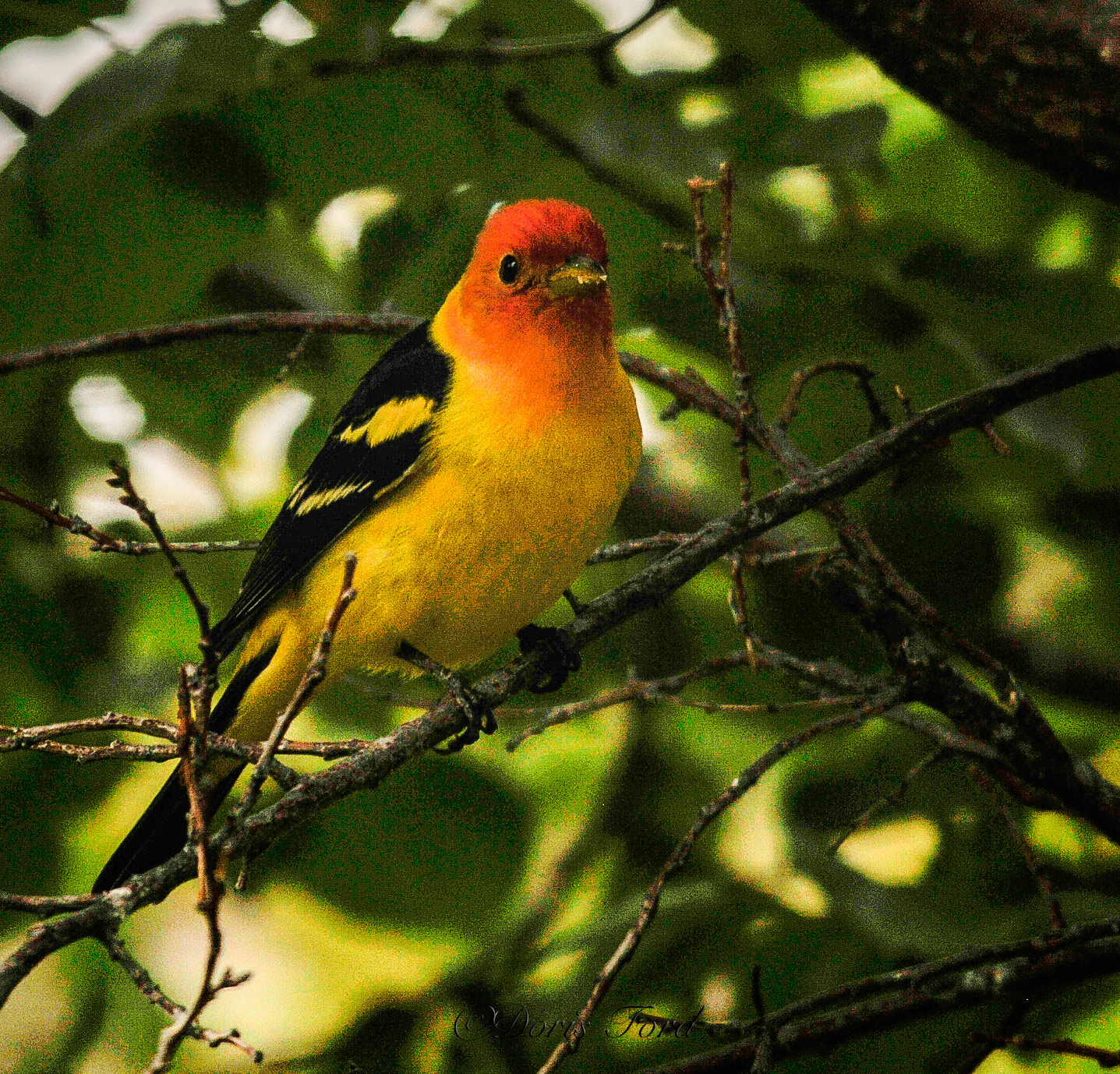 Birds that are frequent visitors are: Bush tits, House Finch,Grey Headed Junco, Oregon Junco, Spotted Towhee, White Winged Dove,Eurasian Collard Dove, Northern Flicker, Canyon Towhee, Lesser Goldfinch, Mountain Chickadee,Woodpecker, Ravens. These birds we see between December and April. A variety of Hummingbirds come in late March and April, and stay until sometime in October or even later! Later in the summer other birds come, and occasionally a Coopers Hawk comes to check out any unaware feeding birds. One of my favorites is the Western Tanager.