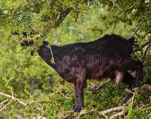 Goats on trees are found mostly only in Morocco. The goats climb them because they like to eat the fruit of the argan tree, which is similar to an olive. Farmers actually follow the herds of goats as they move from tree to tree. Not because it is so strange to see goats in trees and the farmers like to point and stare, but because the fruit of the tree has a nut inside, which the goats can’t digest, so they spit it up or excrete it which the farmers collect. The nut contains 1-3 kernels, which can be ground to make argan oil used in cooking and cosmetics. This oil has been collected by the people of the region for hundreds of years, but like many wild and useful things these days, the argan tree is slowly disappearing due to over-harvesting for the tree’s wood and overgrazing by goats.